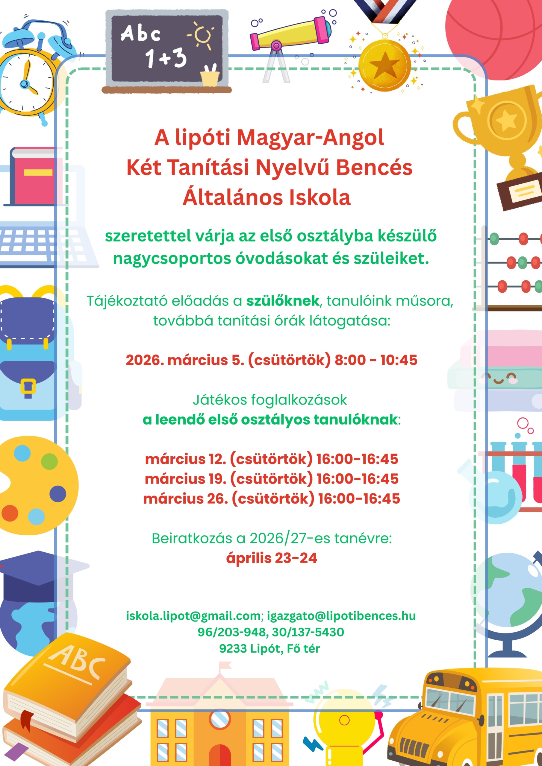 Iskolakóstoló 2026 febr 25 Szeretettel várjuk az iskolába készülő óvodásokat és szüleiket tájékoztató előadásunkra, valamint iskolakóstoló foglalkozásainkra.
